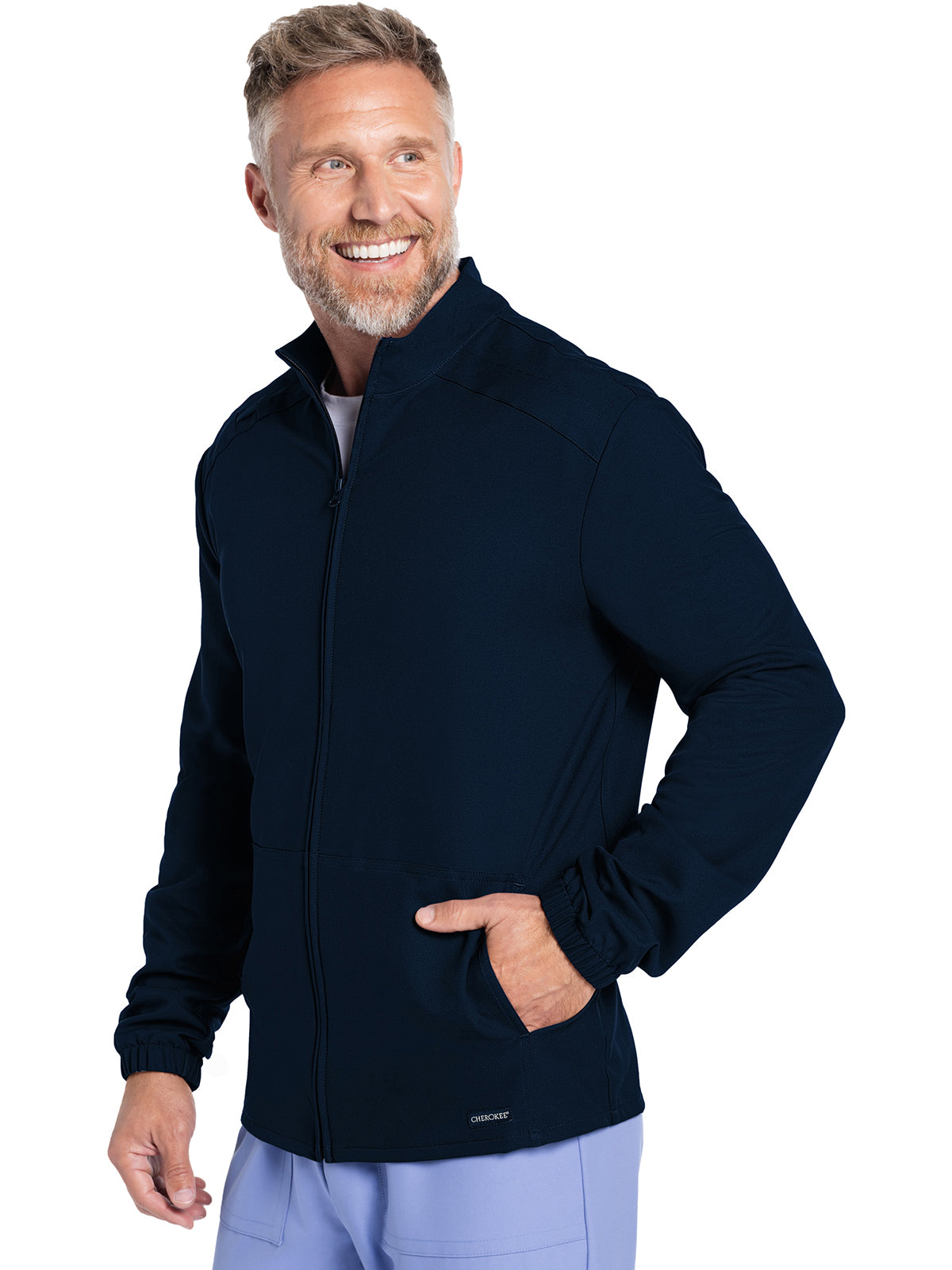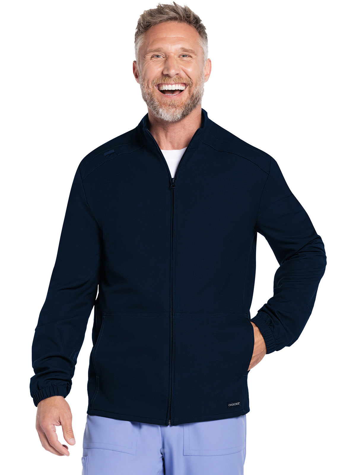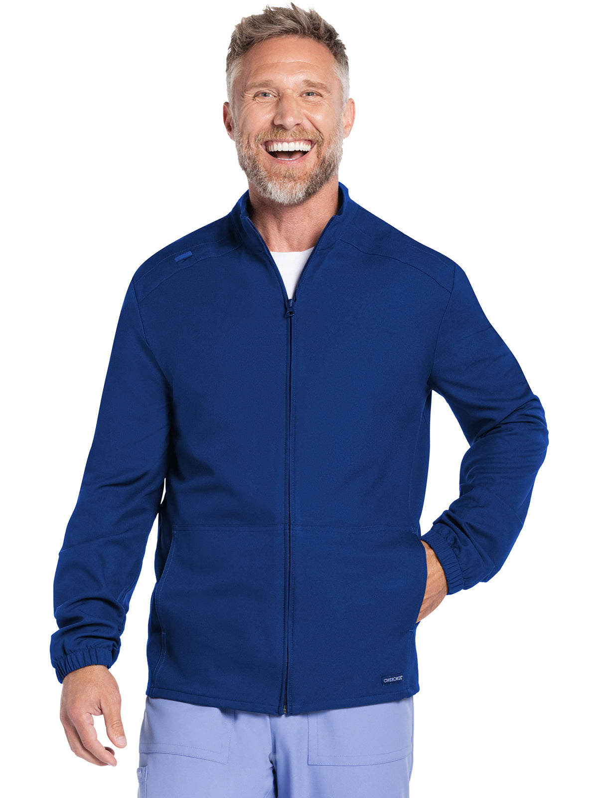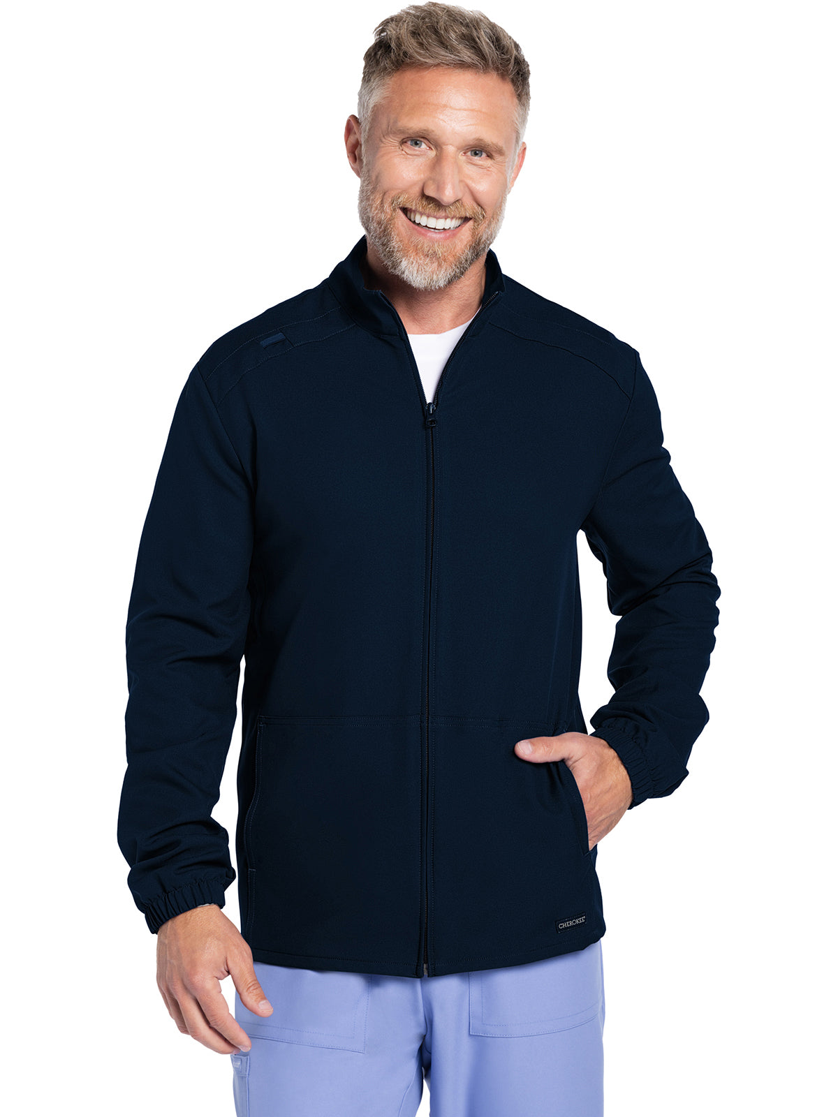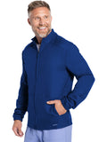 Work-to-weekend approved, this Men's zip front jacket has a stand-up collar and high-low hem. The shoulder panels include tonal triple needle stitching and a flat bungee for an ID badge on the wearer's right shoulder. There are two roomy side entry patch pockets for storage. Elasticized sleeve hems. Decorative tonal topstitching finishes this scrub jacket. Men's fit. Center back length: 28 1/2"
