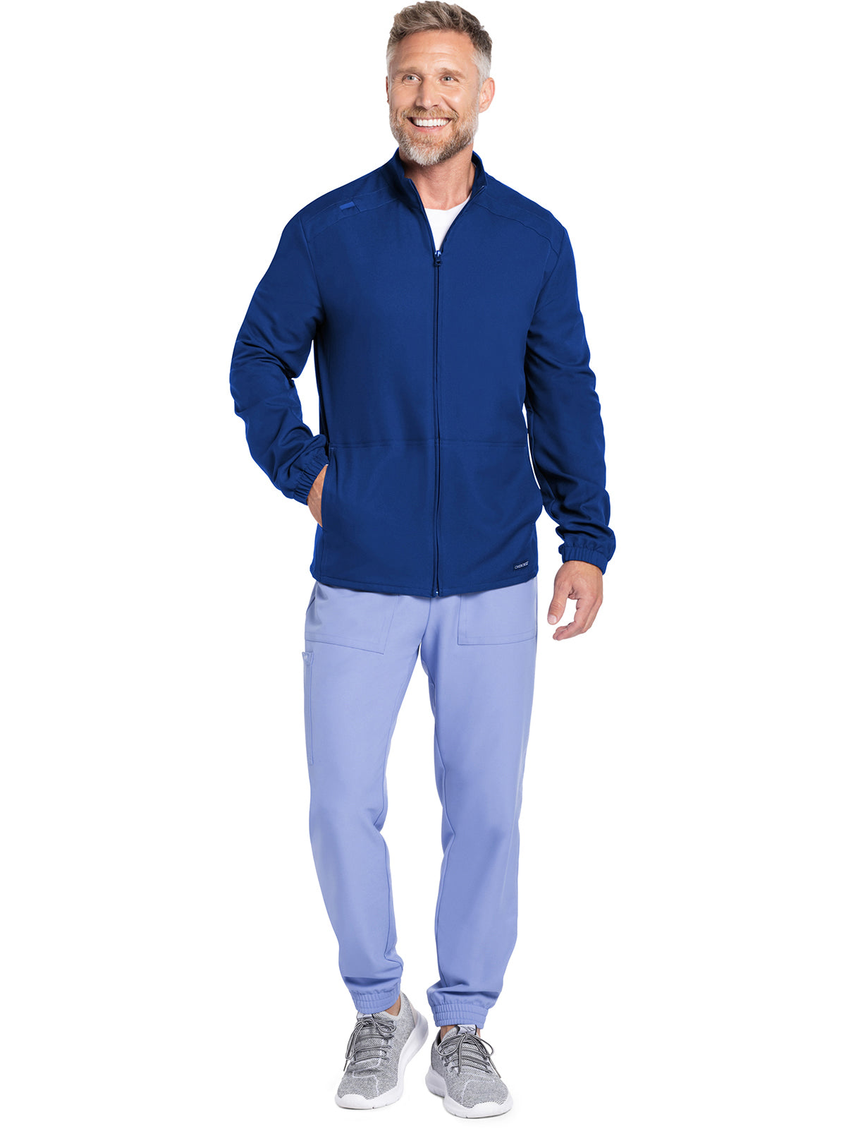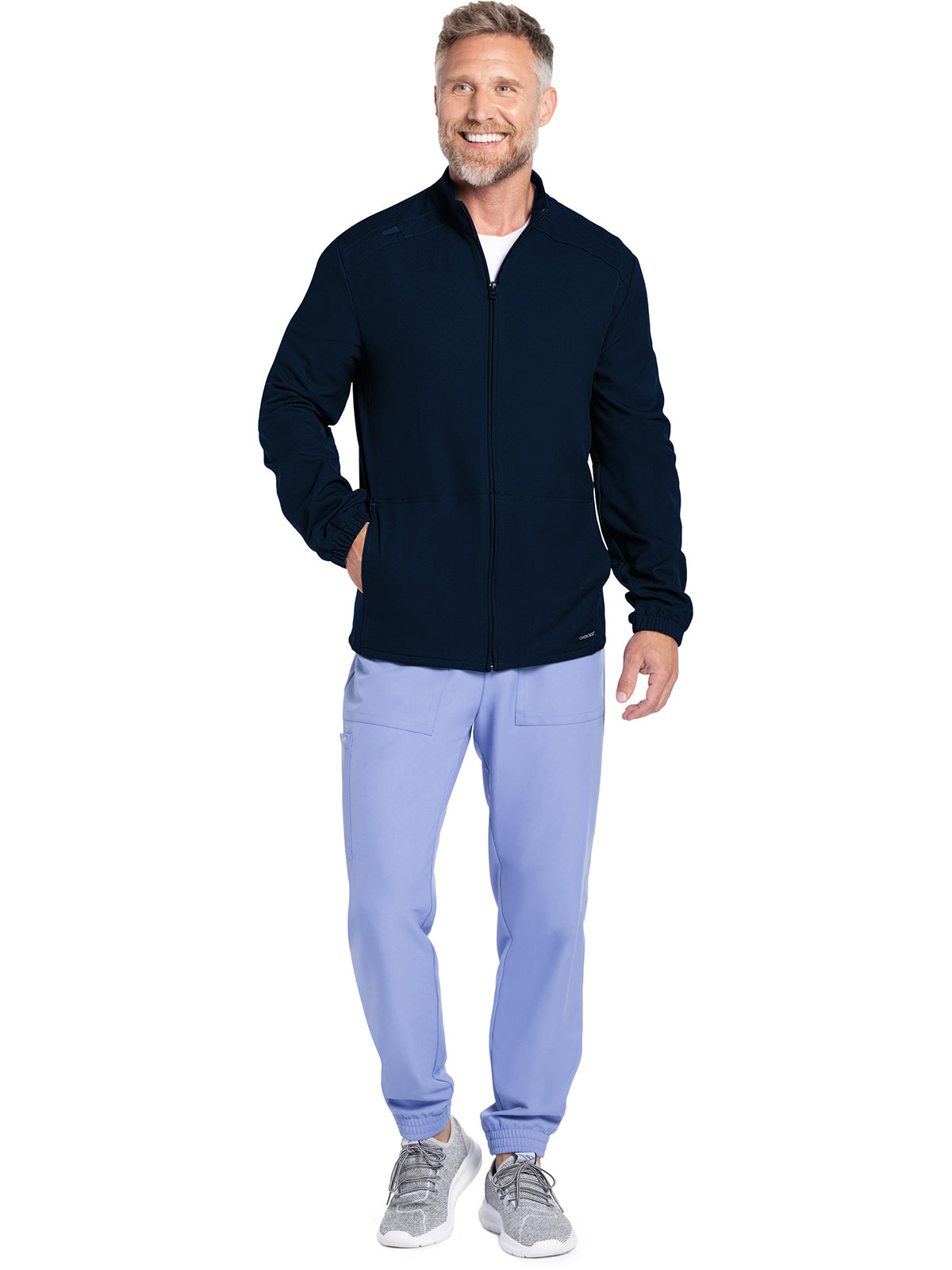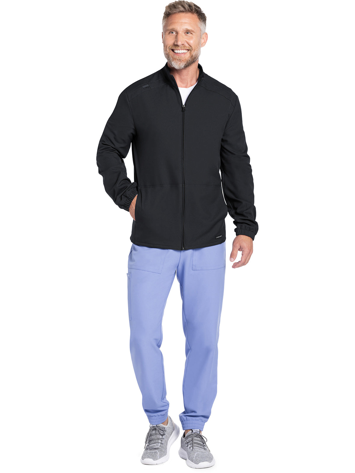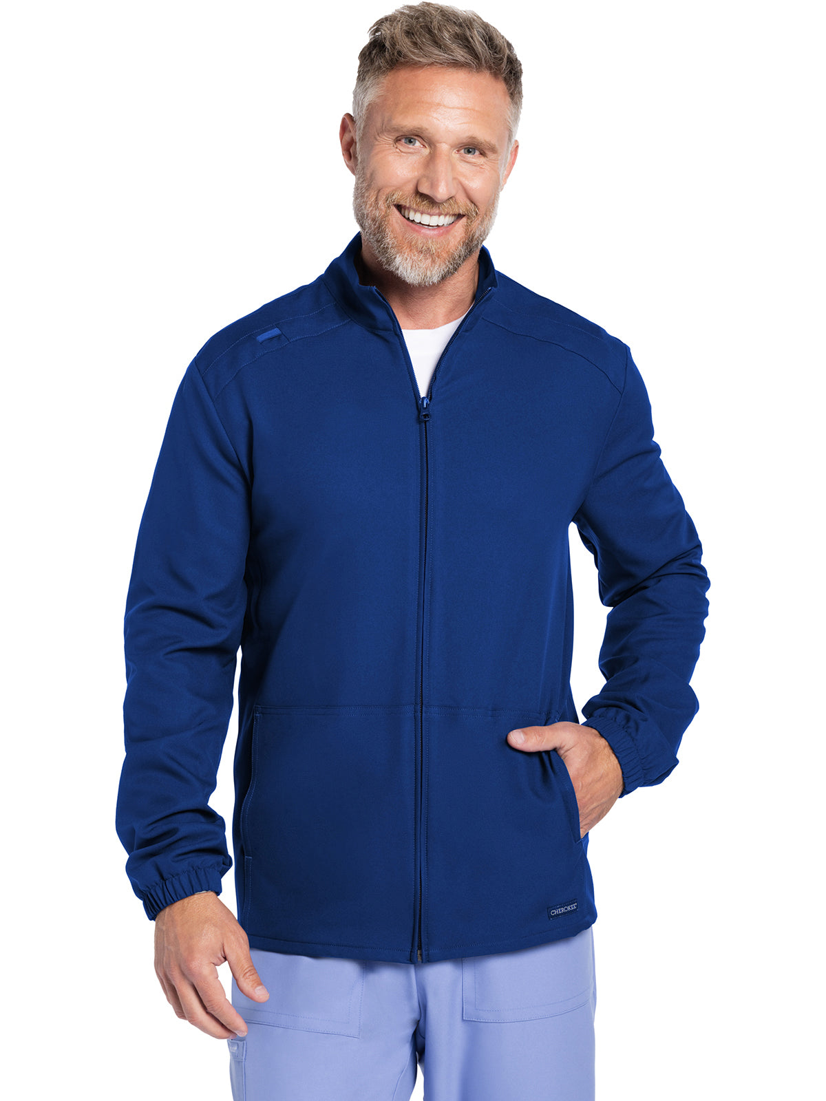 Work-to-weekend approved, this Men's zip front jacket has a stand-up collar and high-low hem. The shoulder panels include tonal triple needle stitching and a flat bungee for an ID badge on the wearer's right shoulder. There are two roomy side entry patch pockets for storage. Elasticized sleeve hems. Decorative tonal topstitching finishes this scrub jacket. Men's fit. Center back length: 28 1/2"